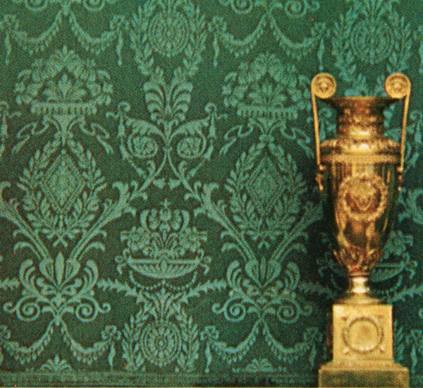 Detail of the old damask wallcoverings in 1962, shortly before being replaced (White House Historical Association)