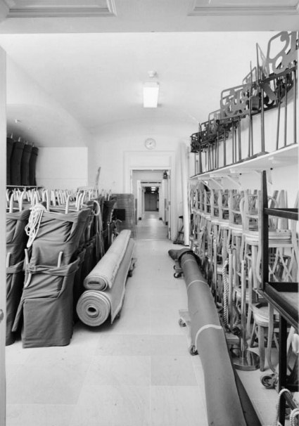 Storage HallThis space is used to store many of the chairs and rugs necessary to conduct social events at the White House. It's about 28 feet by 15 feet. For the first century of its life, this space was part of the old kitchen and furnace room. In his memoirs, Chief Usher Ike Hoover described the kitchen in 1891: