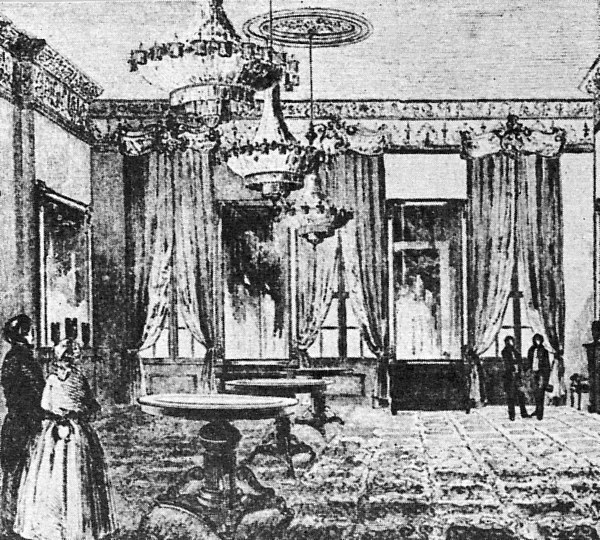 New carpet before the ceiling and chandeliers were changed, circa 1872 (New York Public Library)
