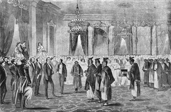 Etching of President Buchanan meeting diplomats from Japan (New York Public Library)