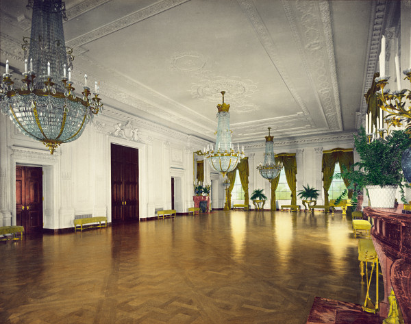 Hand-tinted photo of the East Room in 1904, during the Theodore Roosevelt administration (Library of Congress)