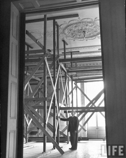 The East Room in 1949, with celing supports in preparation for demolition (Life)
