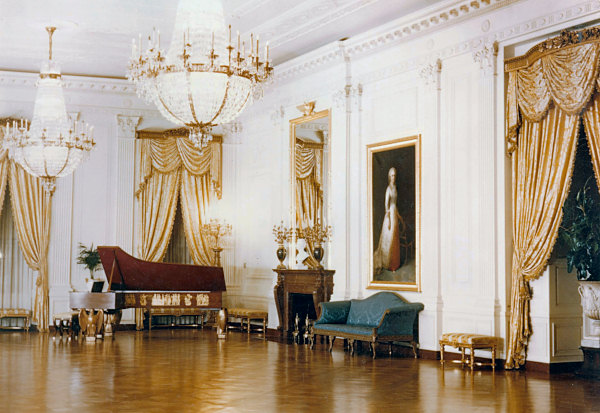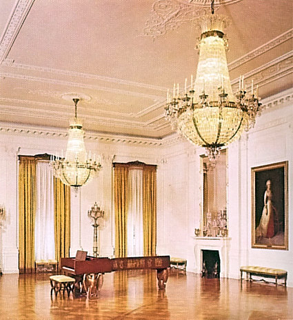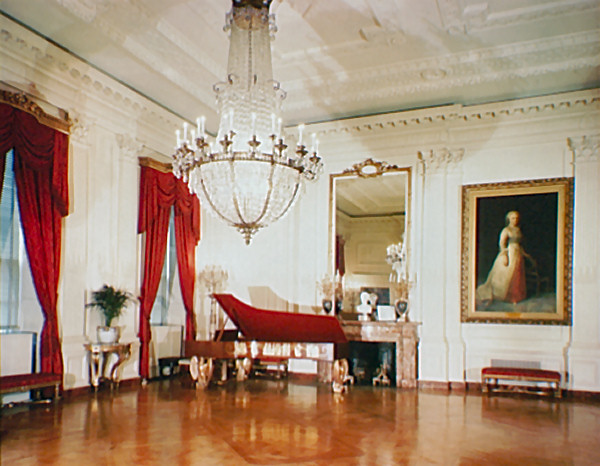 Hand-tinted photo of the East Room, circa 1904, after the Roosevelt renovation (Library of Congress)