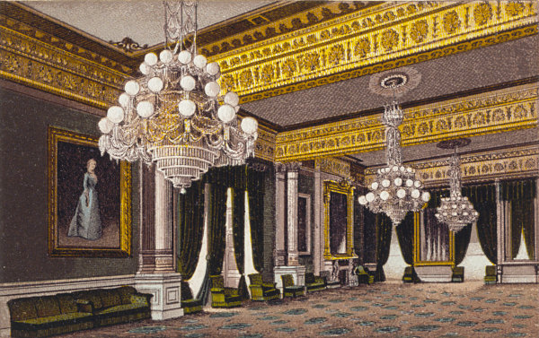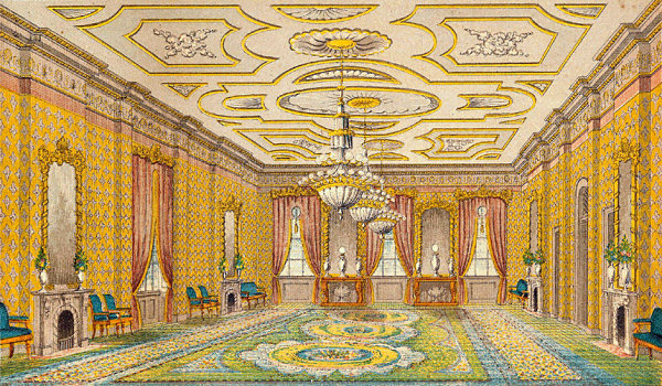 Hand-tinted etching of the East Room around 1881 (Library of Congress)