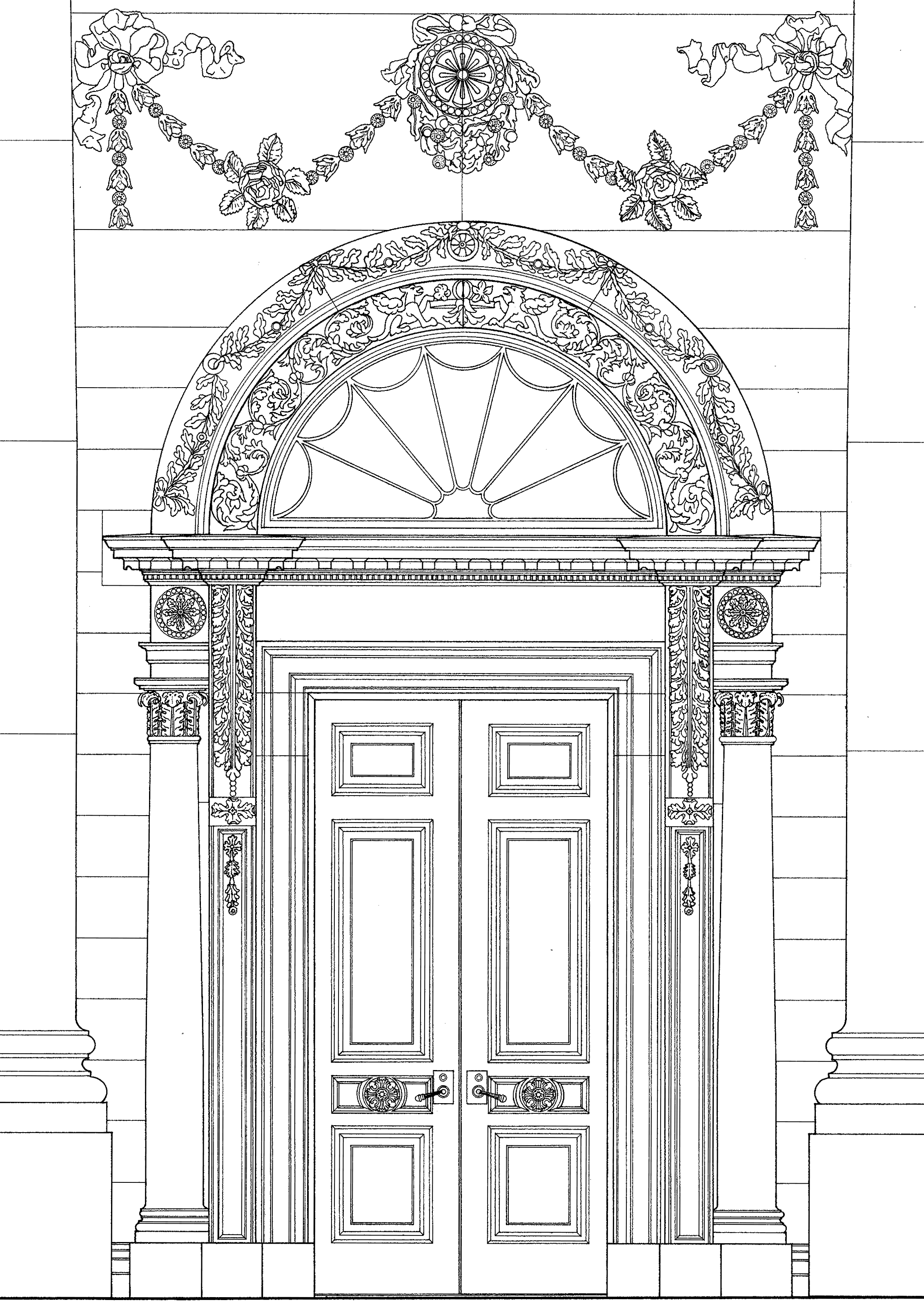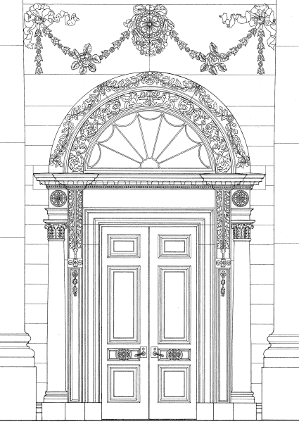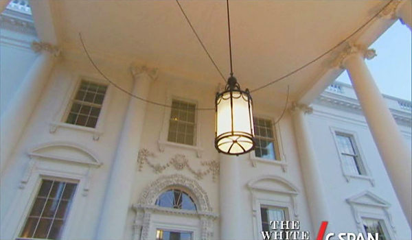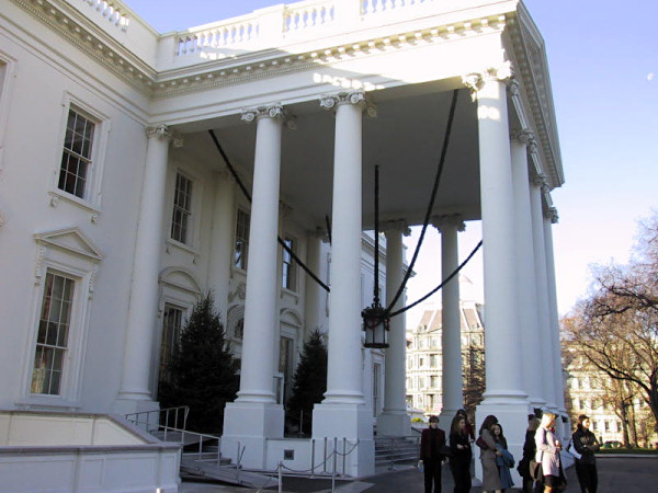 The President's Front DoorAdded around 1830, the North Portico was added to the White House, in keeping with the Federal Style and the original designs for the building. During the late Victorian era, Louis C Tiffany installed Tiffany glass in the windows, as he had throughout the house, later removed in the 1902 renovation. In poor weather, a small glass vestibule is installed at the front door to create an air lock that reduces cold drafts sweeping into the Entrance Hall. Such drafts were such a problem in the early days of the White House that, in the late 1800s, the Entrance Hall was separated from the Cross Hall by a Tiffany glass screen. Immediately to either side of the North Portico are the open courts that give light to the northern side of the ground floor and provide access to the basement for pickups and deliveries. In the time of President Tyler, the acclaimed author Charles Dickens wrote of his visit: