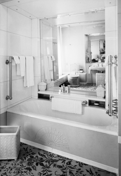 Sitting Room Fit for a QueenLike the other rooms on the east side of the second floor, the Queens' Sitting Room was, for its first hundred years, used as part of the president's offices. When the West Wing was constructed in 1902 and the executive offices moved there, this room became a sitting room for guests in the Queens' Bedroom (then called the Rose Bedroom or Pink Bedroom). After the Kennedy renovation in 1963 restored it to Victorian style, the room has remained essentially the same ever since. Lady Bird Johnson enjoyed this room's privacy and used it as a retreat when she had work that required more concentration than she could find at her desk in her bedroom. The Queens' BathConnected to the Queens' Sitting Room is the Queens' Bath. It features a wicker commode that covers the toilet. |