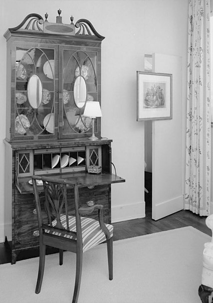 South BedroomThis is a large bedroom on the third floor of the White House. It is a suite, with its own bathroom around the corner from the entrance. A small closet is accessible through a hidden door on the east wall. The room is designed to be able to stand alone or used as the master bedroom in a family suite with the room next door as a child's bedroom and the corner room as a private sitting room or second child's bedroom. In the Kennedy era, this was the "Pineapple Bedroom," so-named for the pineapple finials on the two matching beds that dated to the mid-1800s. The walls were covered in green Japanese silk wallpaper. Draperies and bedcovers were made of green and blue chintz, while the floor was covered with the blue Queens' Bedroom old carpeting, which was specially dyed for the purpose. The room next door was the "Pineapple Sitting Room."