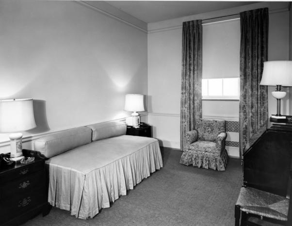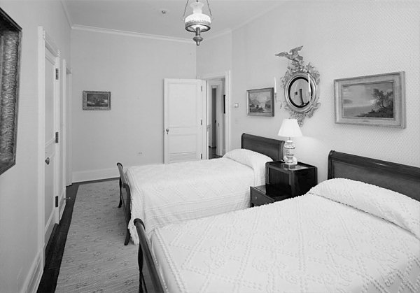 South BedroomThis is a small bedroom on the third floor of the White House. In the Kennedy era, this was the "Pineapple Sitting Room" (or "Banquette Room"), covered in green Japanese silk wallpaper. The room to the west was the "Pineapple Bedroom," and the two formed a suite. This room and the corner room are instead sometimes set up as a suite, as they can share a bathroom.
