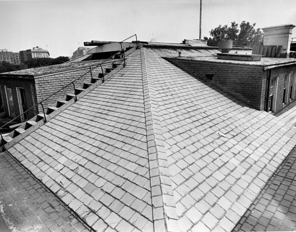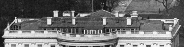 Southwest corner before the raising of the corners of the roof, 1950 (Truman Library)