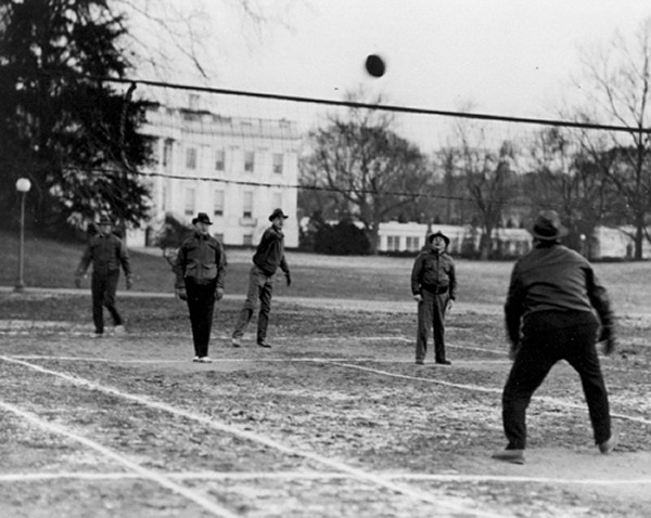 Tee BallA new tradition at the White House is the annual South Lawn Sluggers tee ball game instituted in 2001 by George W Bush, former owner of the Texas Rangers. The game seeks to promote health and fitness as well as an appreciation for the game and for sportsmanship. Hoover BallPresident Hoover’s advisers often came to the White House for breakfast and exercise. Hoover and members of his Cabinet played a game they called "Hoover ball" on the south lawn of the White House. Play involved throwing the heavy medicine ball over the net. |