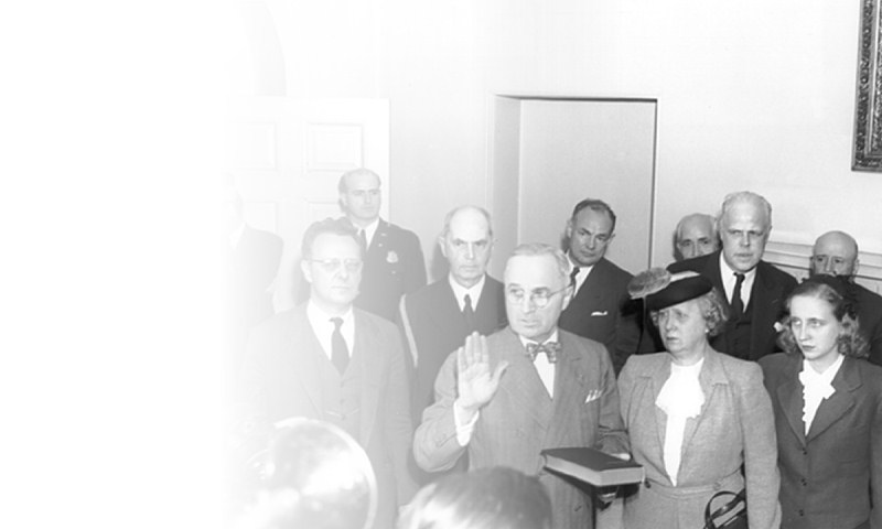Harry Truman is sworn in as president in 1945 in the Cabinet Room with wife Bess and daughter Margaret by his side. |