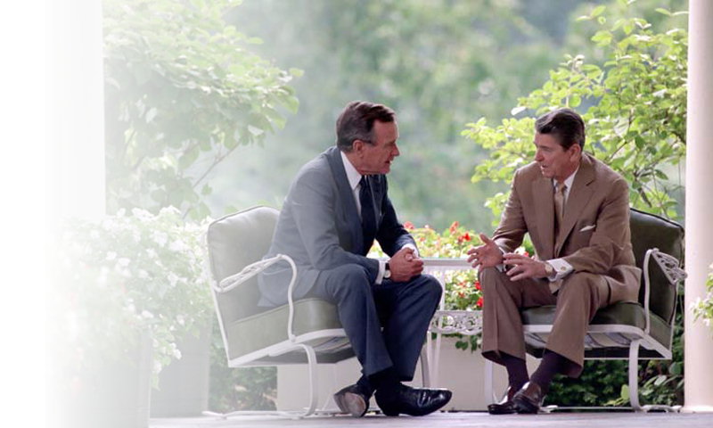 President Reagan with VP Bush in 1988 on the Oval Office Patio. (Reagan Library) |