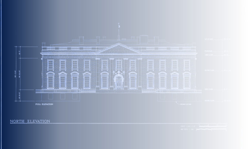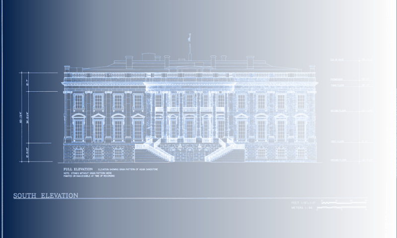 A blueprint-style image of a scale drawing of the north face, done as part of the HABS project in 1992.