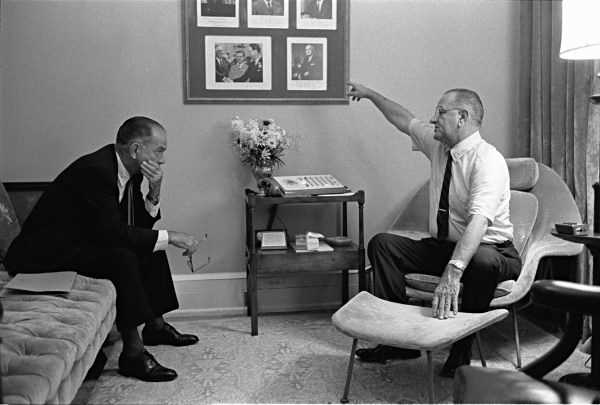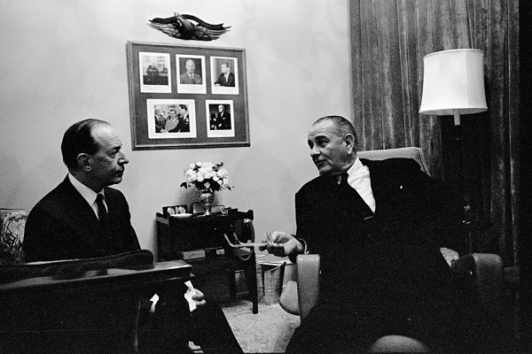 Lyndon Johnson discussing policy with Senator Fulbright in 1965 (Johnson Library - Yoichi Okamoto)