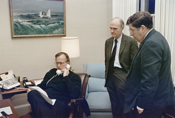 George HW Bush taking a call with staff in 1989 (NARA - Bush Library)