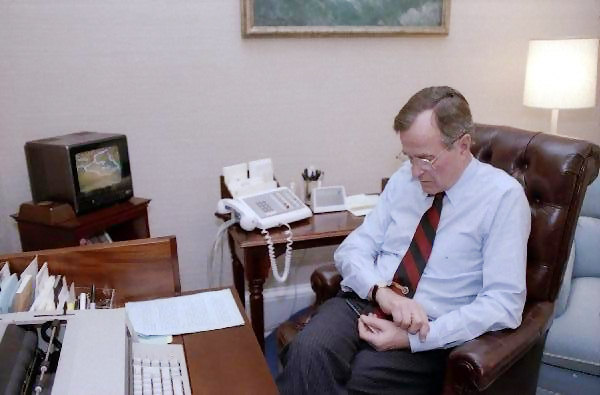 George HW Bush watching television in 1991 (Bush Library)