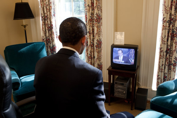 Barack Obama watches Robert Gibbs' first press conference in 2009 (White House - Pete Souza)