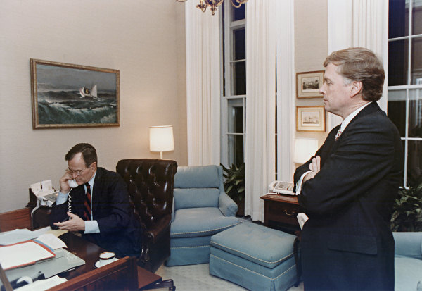 George HW Bush taking a call with Vice-President Dan Quayle in 1990 (NARA - Bush Library)