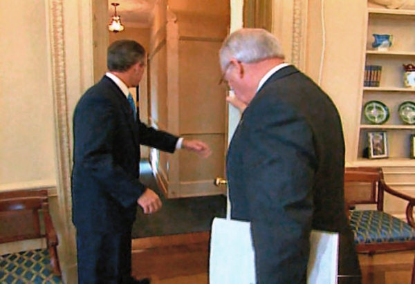 Bush and Cheney enter the study corridor, circa 2002